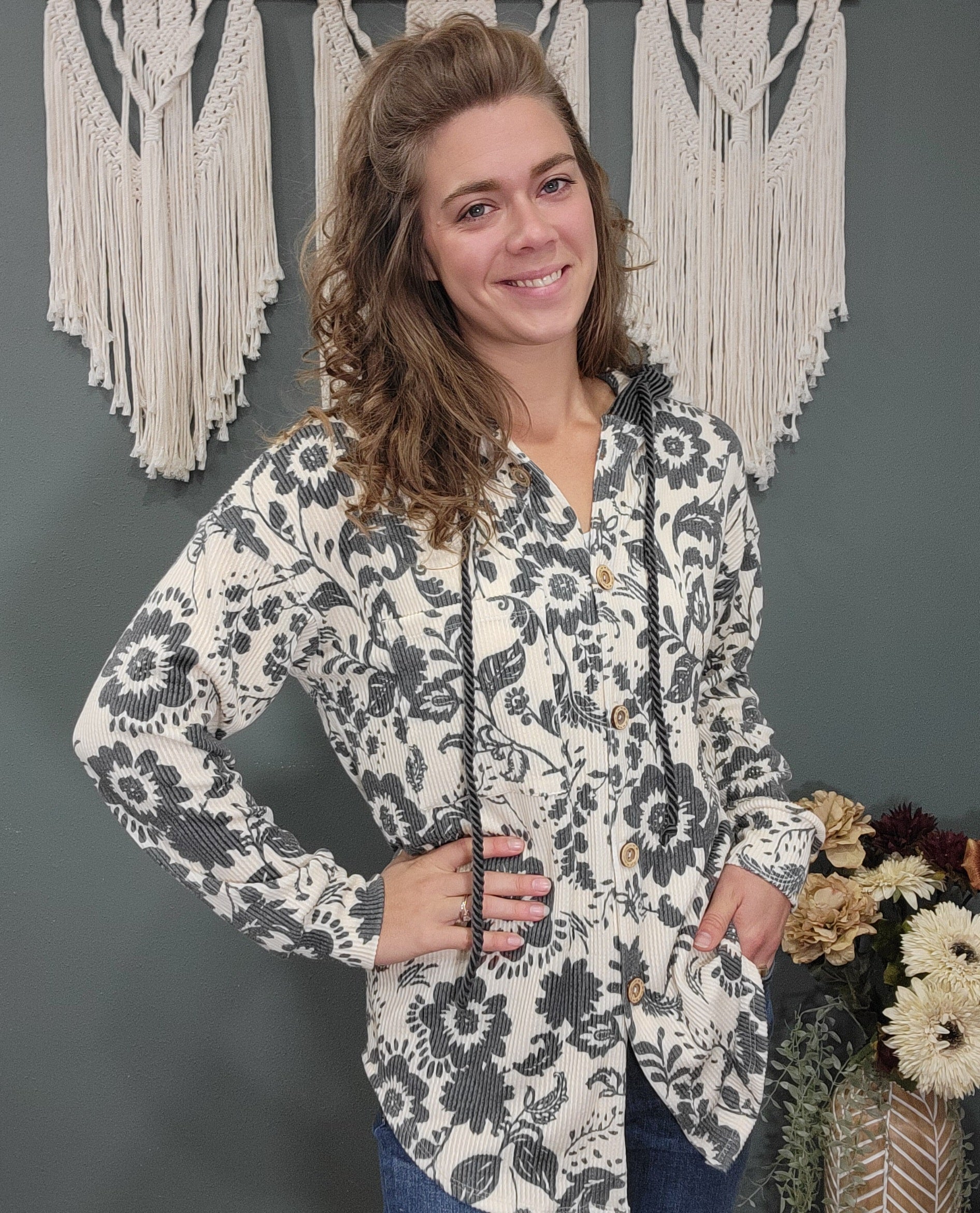 Expertly crafted, the BOMBOM Grey+Cream Ribbed Button Up offers both comfort and class. This ribbed button up features a cream background with elegant grey florals and an attached hoodie. With a true women's fit, it's a versatile piece for any wardrobe.