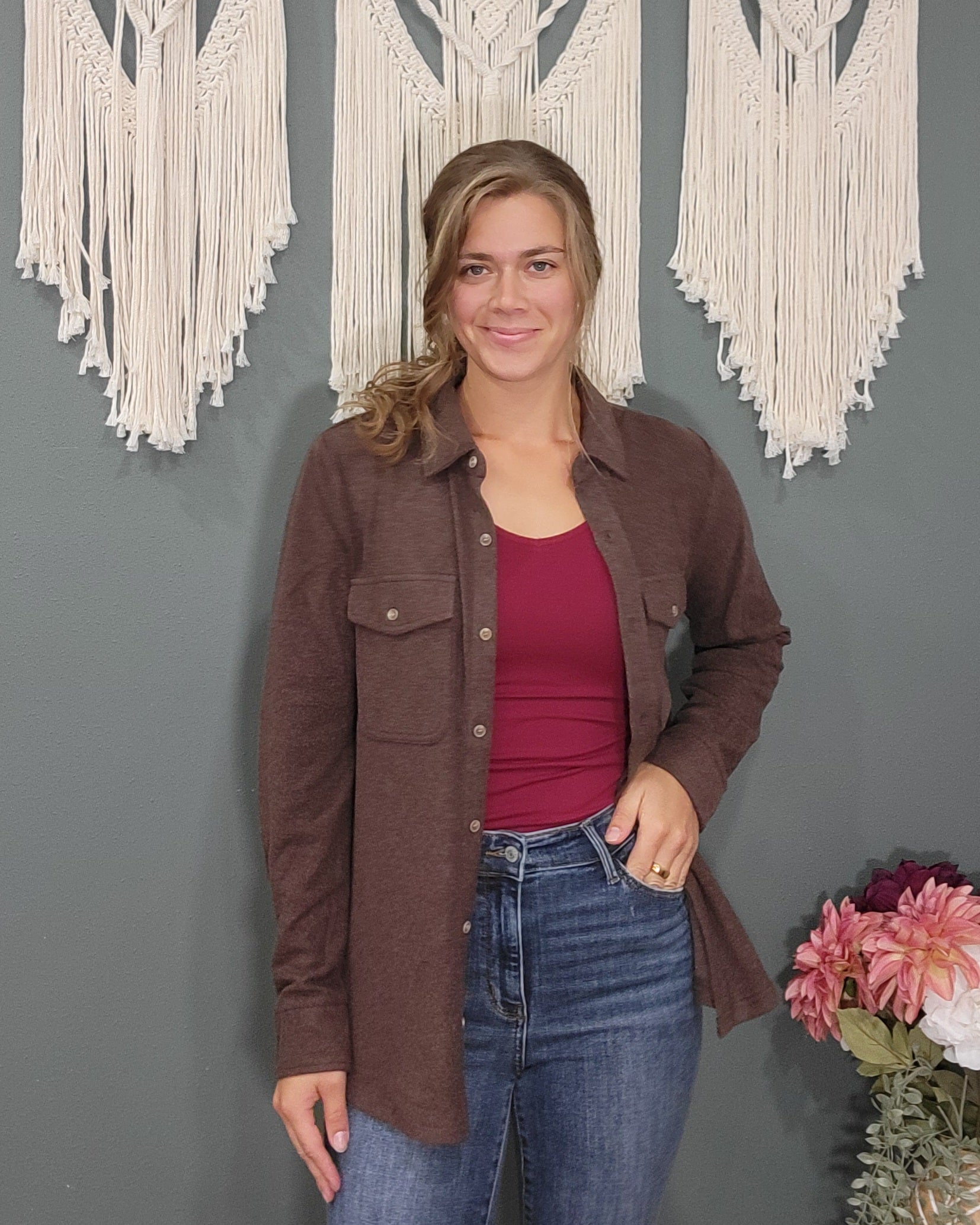 Introducing the Cassian Shirt in Coffee Bean. This button-up shirt is perfect for fall with its soft and comfortable fabric. Elevate your style with this timeless piece.