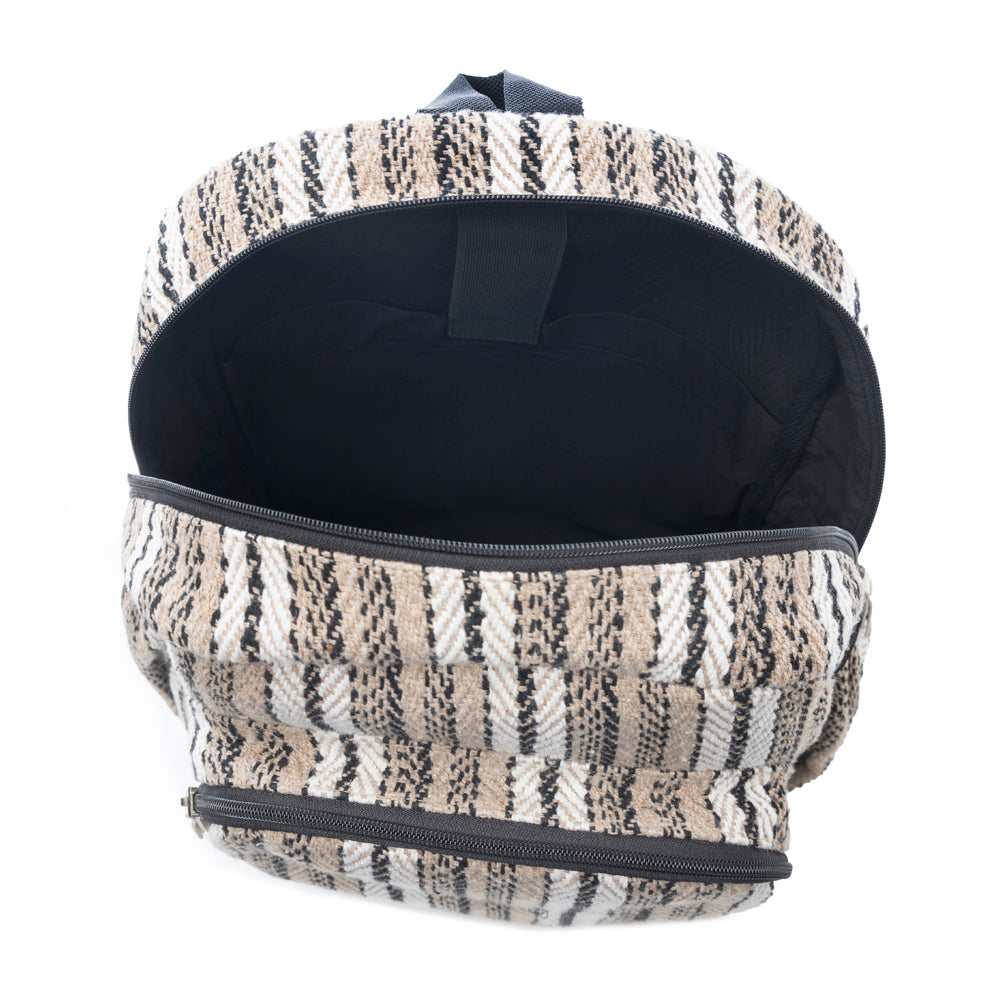 The Myra Echoes of Earth Backpack blends natural textures with everyday practicality. Rug fabric in earthy beige and black stripes showcases rustic artistry while keeping a modern edge. Its structured build offers a roomy main compartment with a laptop slot, plus an inside pocket for small essentials and side holders for bottles. Designed for school, work, or travel, this is a western style backpack. With rugged charm and functional details, it takes a special place among Western backpacks.