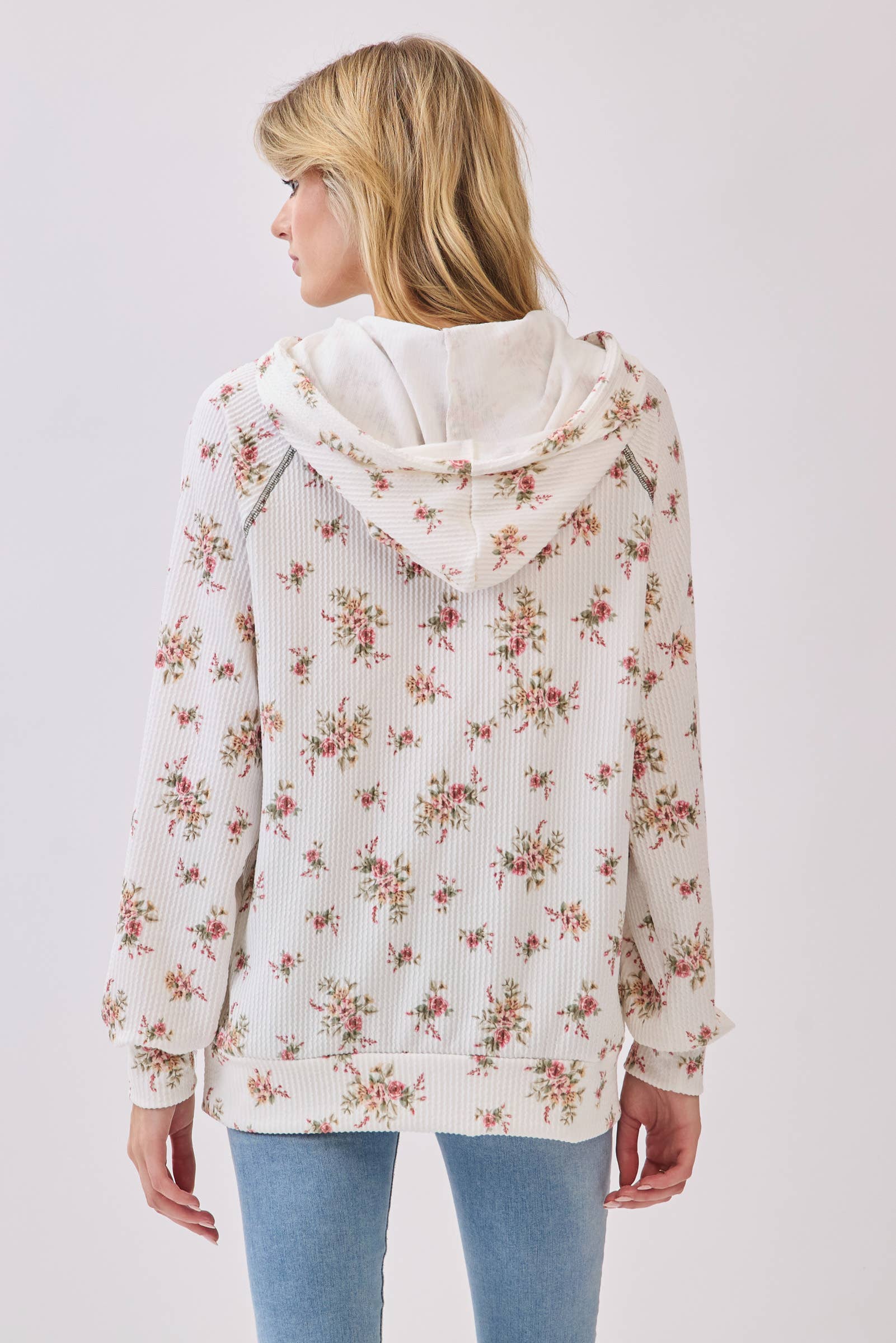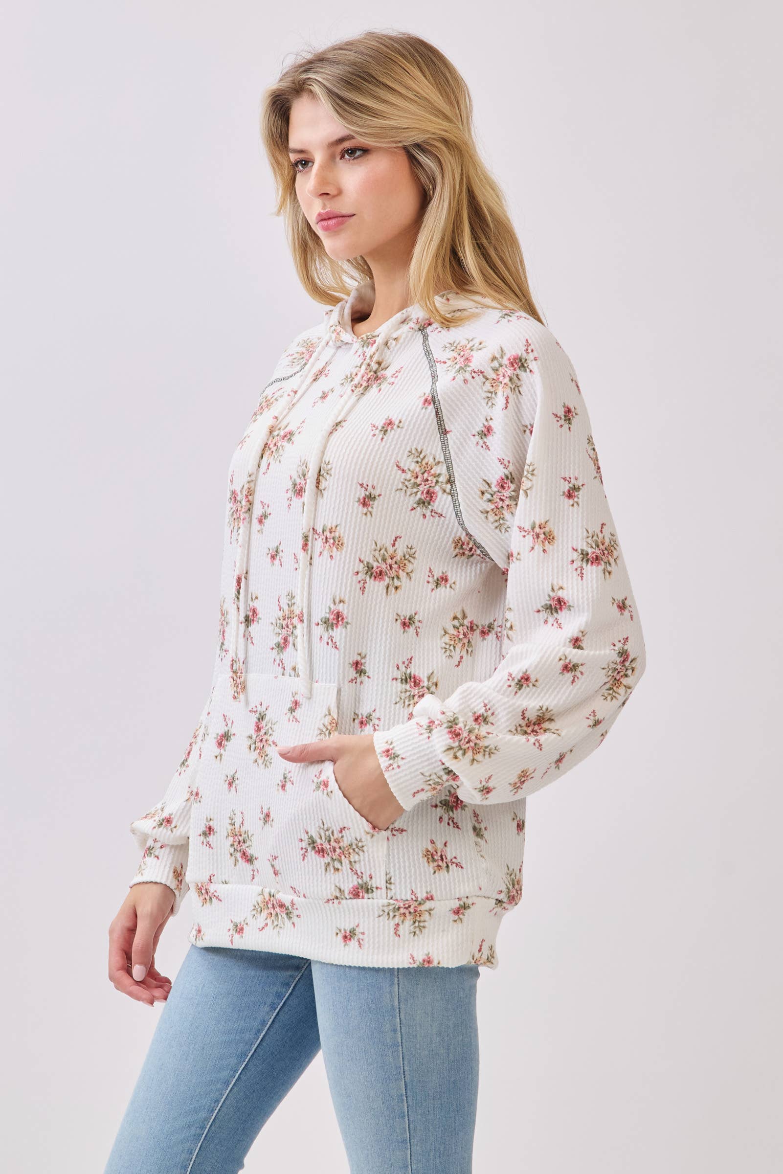 Cozy meets charming in this floral hoodie, crafted from ultra-soft ribbed knit fabric. Featuring a delicate allover rose print, it offers a relaxed fit with a front kangaroo pocket, drawstring hood, and long sleeves.