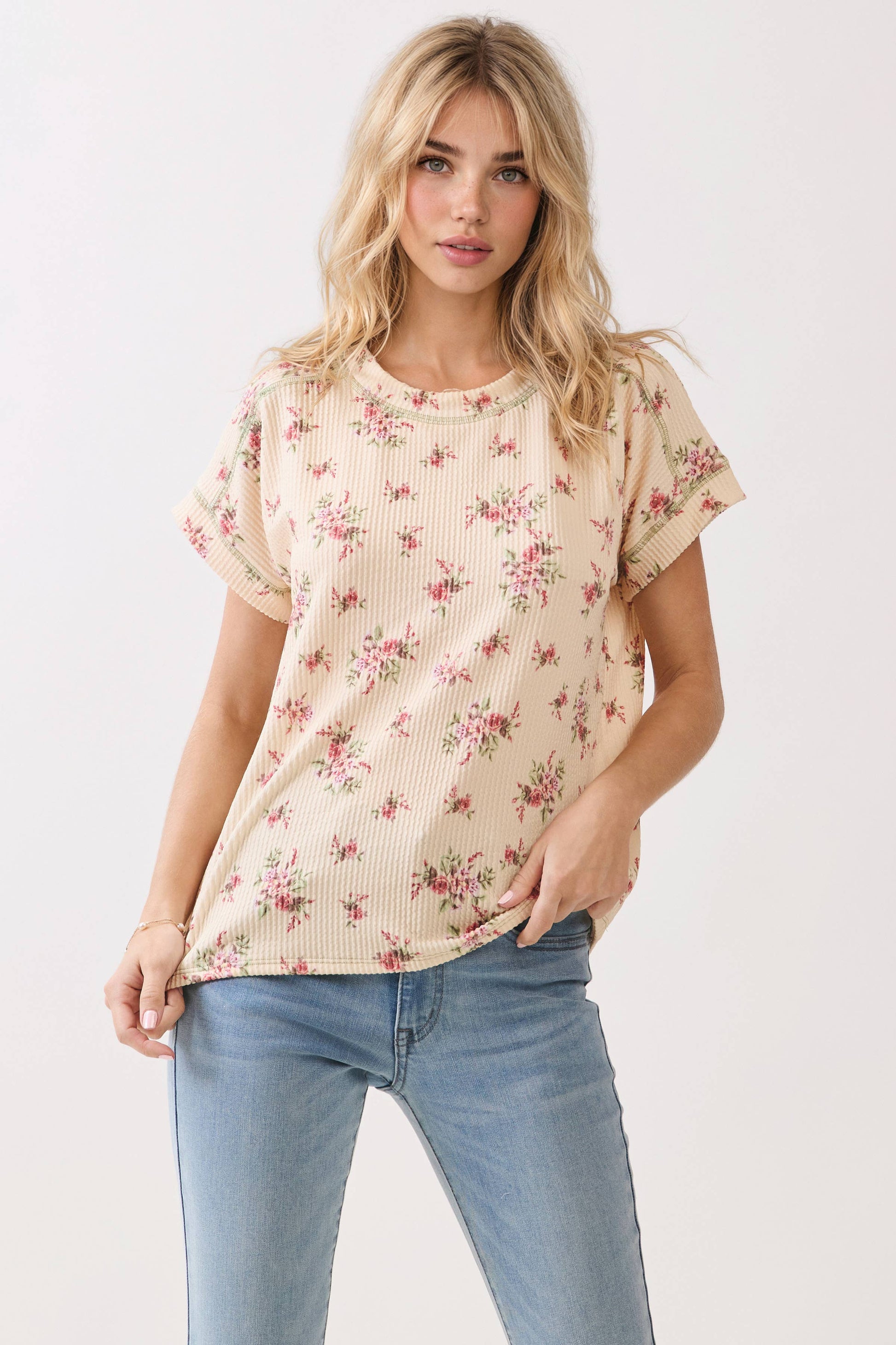 Bombom Floral Ribbed Short Sleeve Knit Top