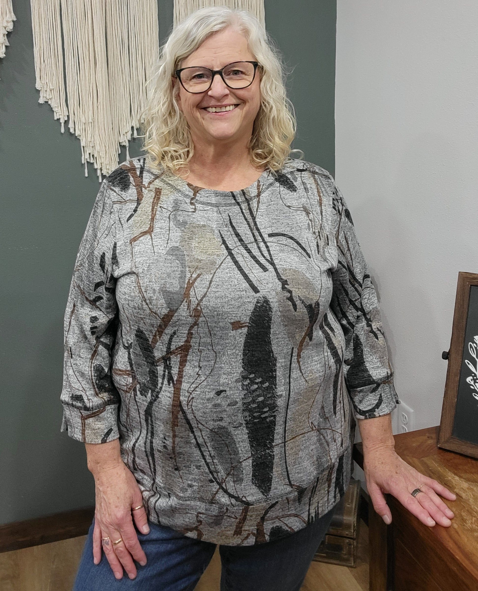 This top is designed for relaxed, comfortable fit with long quarter sleeves and wide hem for added style. The grey background is accented with black and brown splashes, creating a unique and versatile look. Perfect for any woman looking to add fashionable options to her wardrobe.