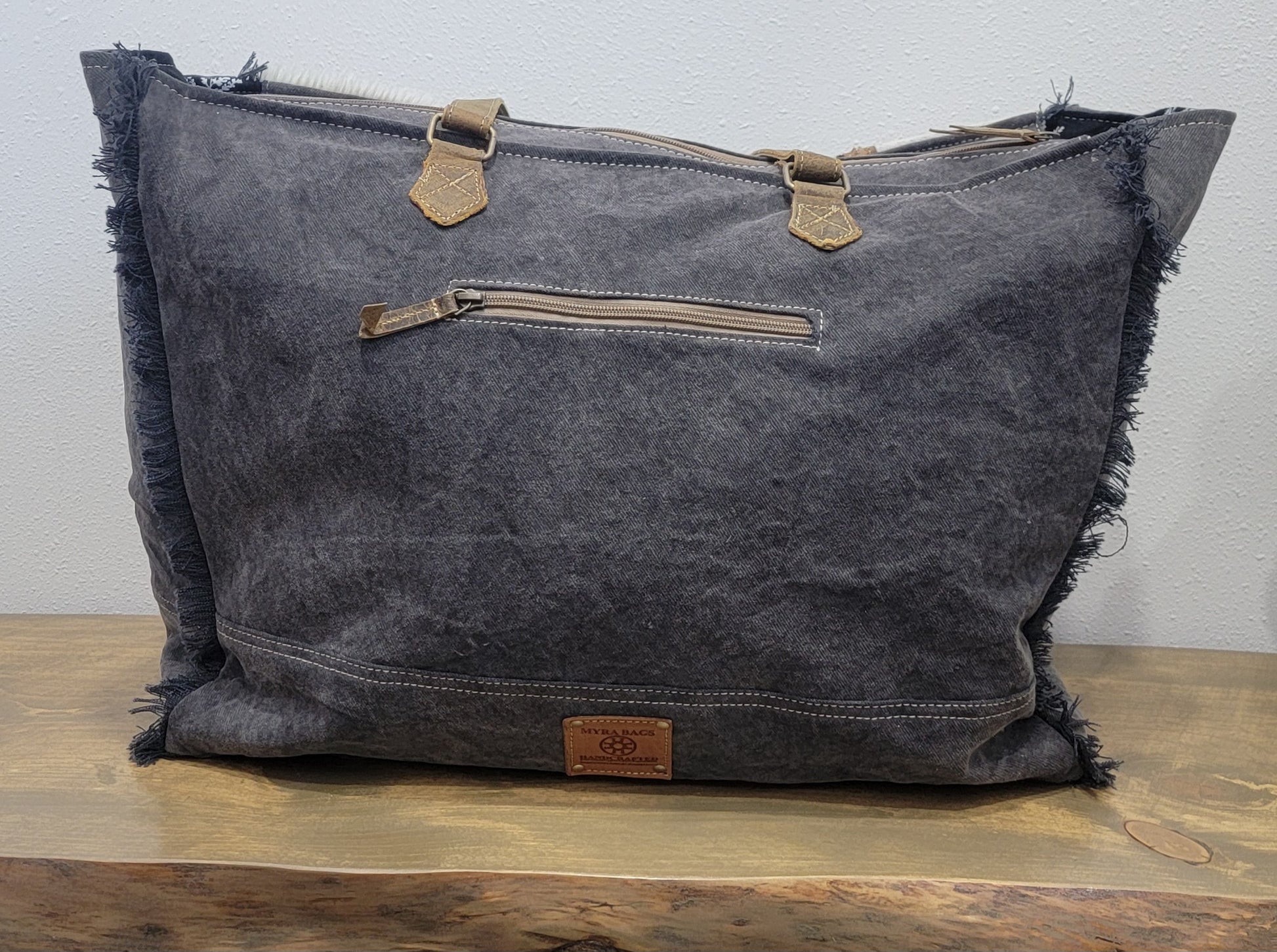 The Myra Desert Diamond Weekender Bag in Prairie Turquoise combines durability with style. Its robust canvas design and cowhide accents provide a resilient exterior, while the zip top and side pocket enhance security and organization. The back zipper offers additional storage, making it ideal for weekend travel.