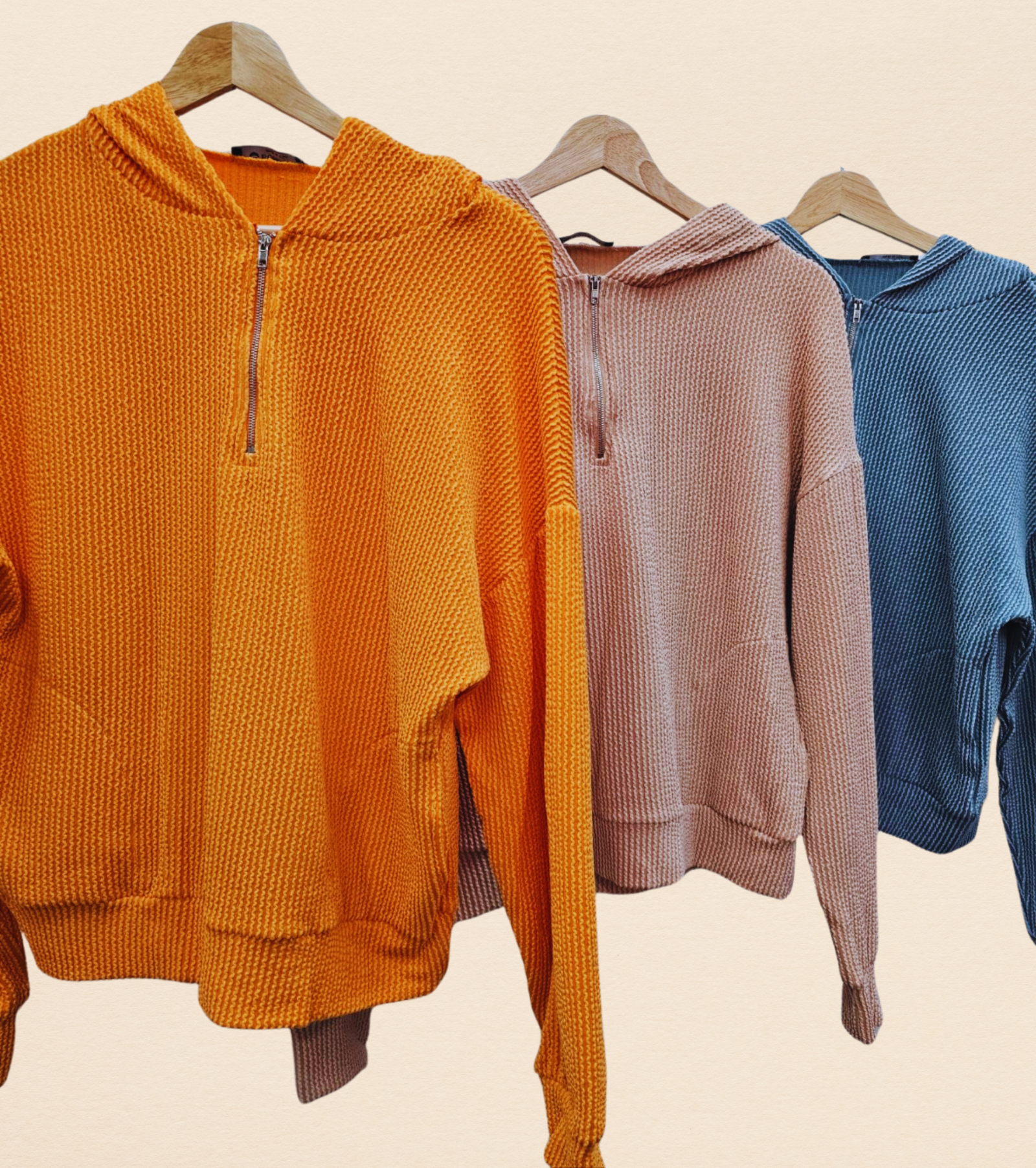Casual, long-sleeve Solid hoodie. The design includes a half-gold zip closure at the front. Relaxed fit. 95% Polyester 5% Spandex