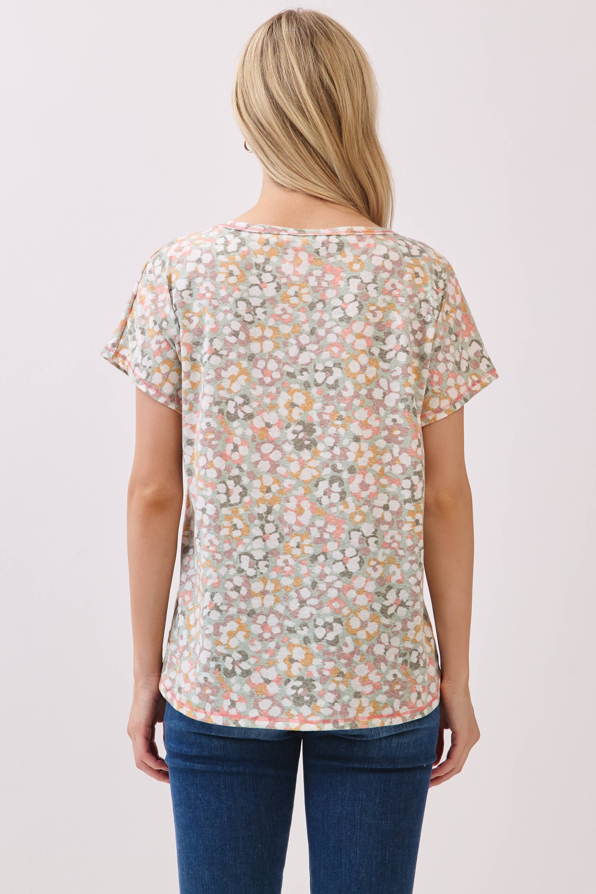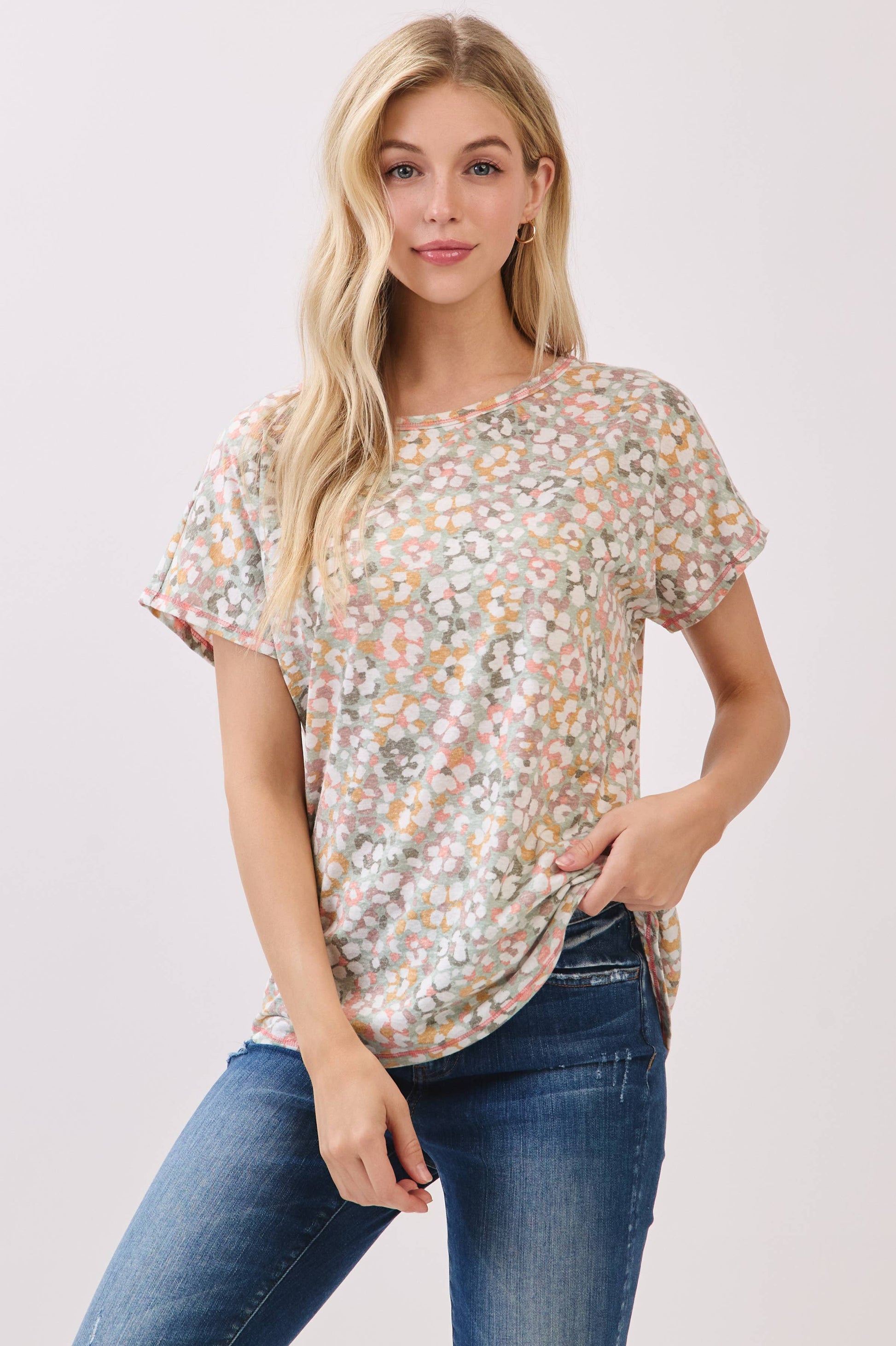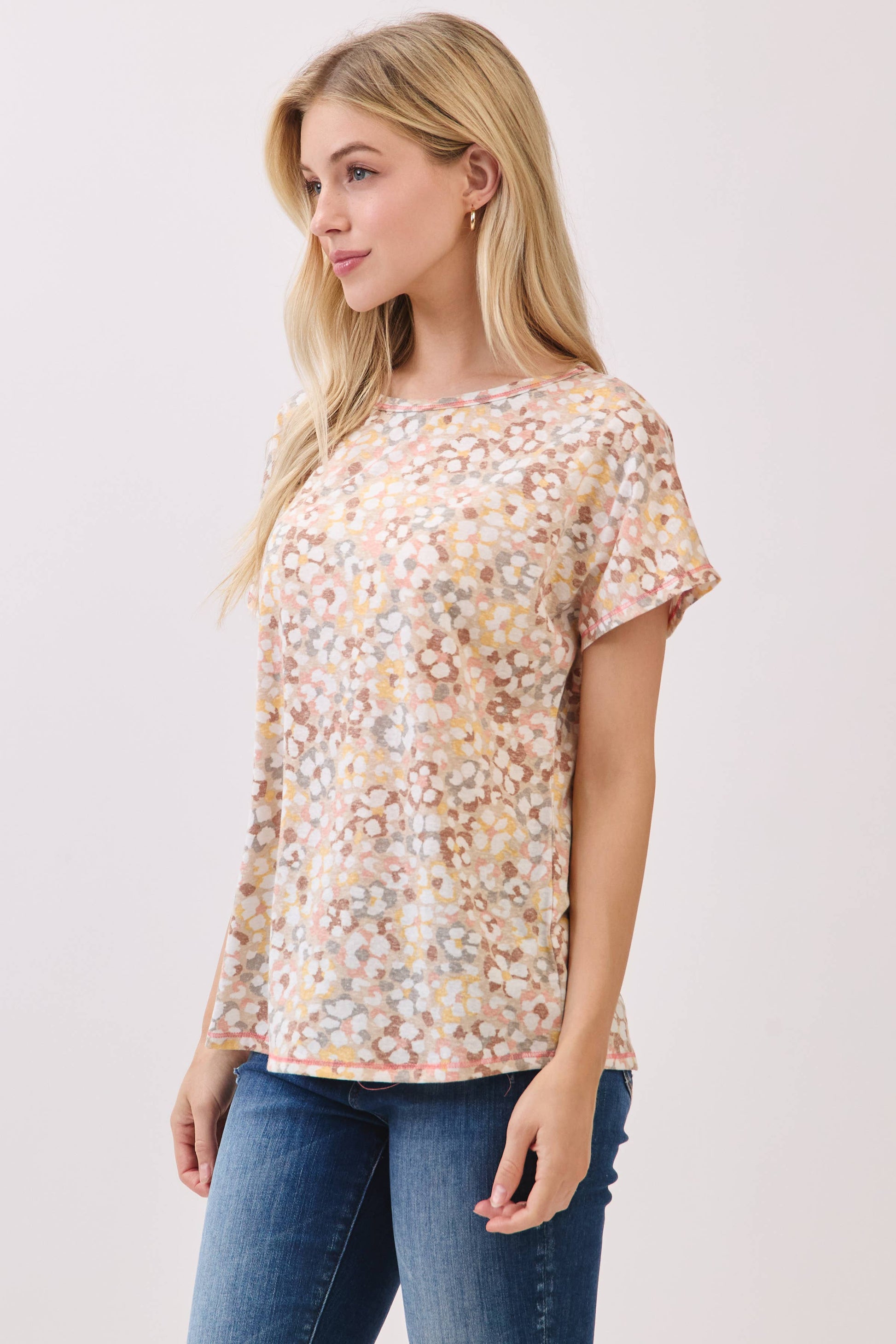 Effortlessly fresh and fun, this knit top features a soft watercolor-inspired dot print in pastel tones. Designed with a relaxed fit, round neckline, and short sleeves, it's perfect for everyday wear. 95% Polyester 5% Spandex