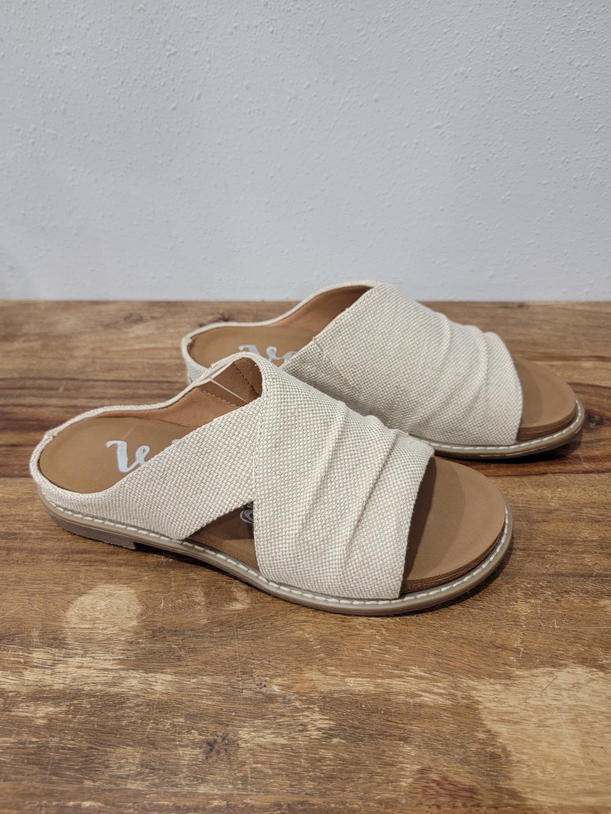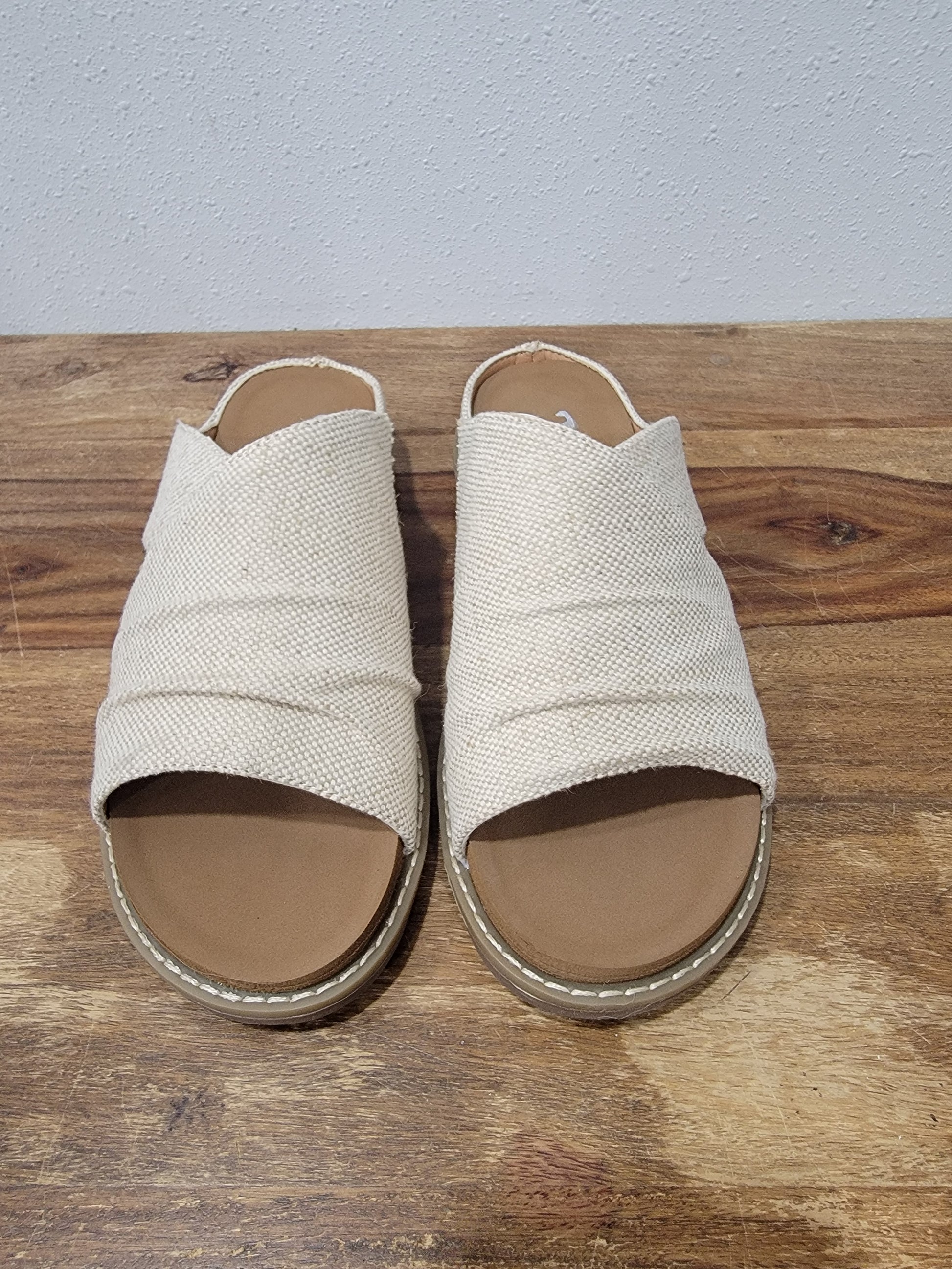 The Very G Kori in Natural provides both style and comfort. With its open toe design, these sandals are perfect for warmer weather. The natural textured material adds a touch of elegance, making them a versatile addition to any wardrobe.